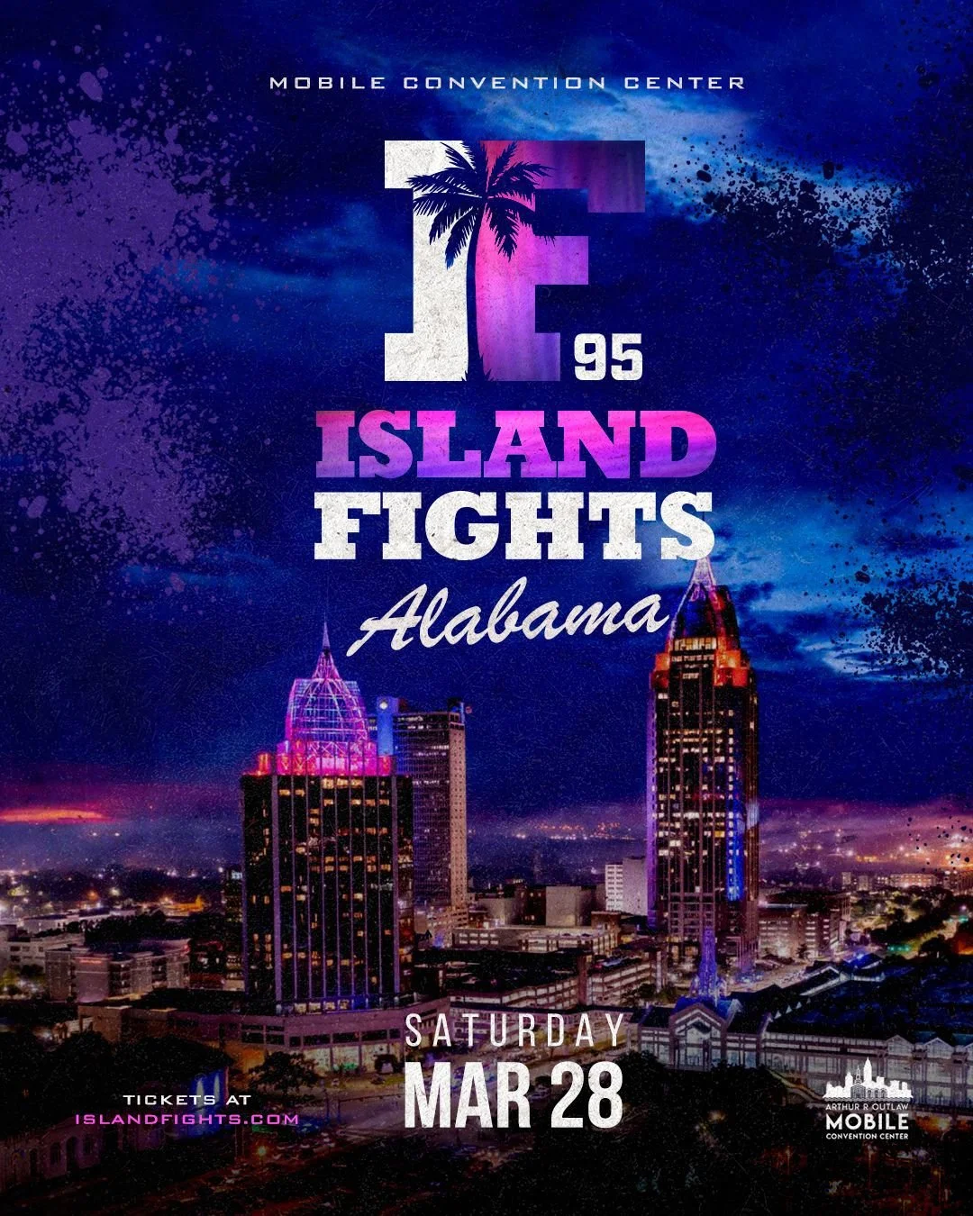 Tickets: Available now. Get ready for an unforgettable night of professional MMA and boxing at Island Fights 95, hosted at the premier Arthur R. Outlaw Mobile Convention Center! As Florida’s premier combat sports promotion expands to the Alabama Gulf Coast, Island Fights brings its signature high-energy action to this state-of-the-art venue. With spacious exhibit halls capable of seating thousands, equipped with top-notch sound and lighting, the Mobile Convention Center is the perfect stage for heart-pounding fights.Expect a thrilling fight card featuring top regional and local talent, showcasing intense MMA and boxing bouts across multiple weight classes. Island Fights is renowned for delivering knockouts, submissions, and unforgettable moments, making this a must-see event for combat sports fans. Stay tuned for the official fight card announcement, including main event and title fight details.